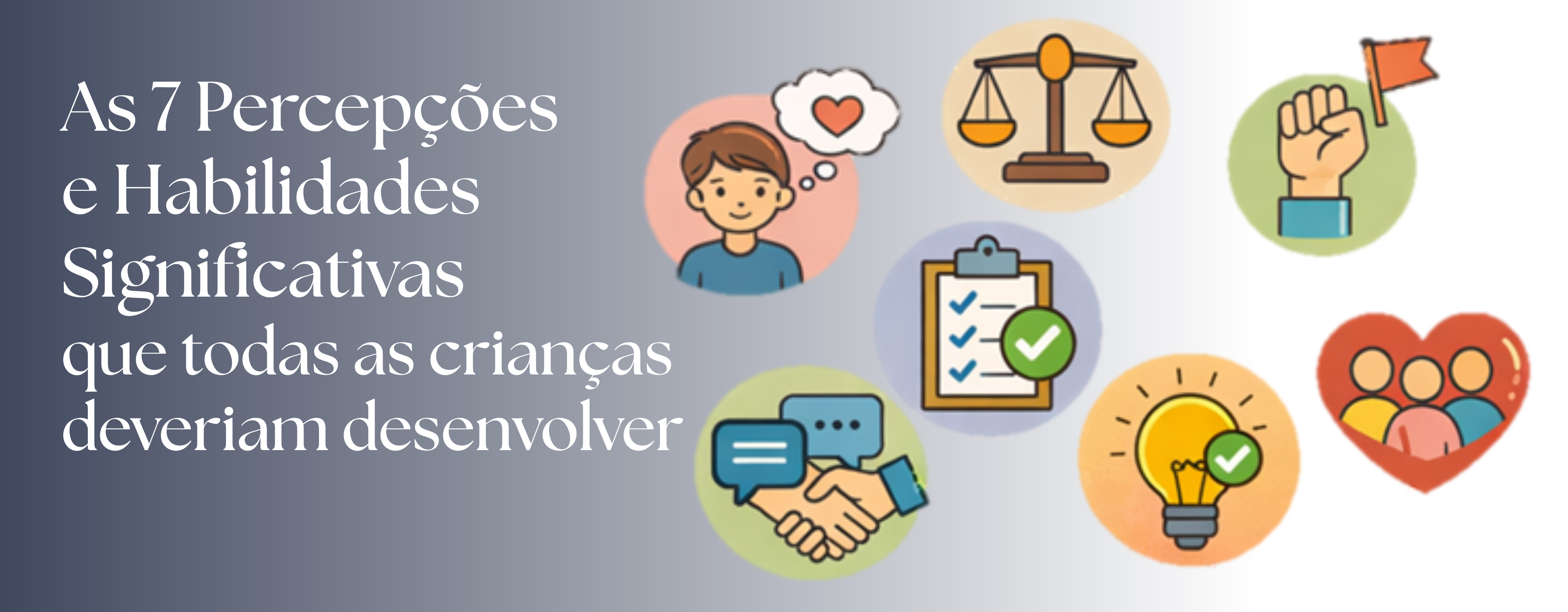 É aqui que entram as 7 Percepções e Habilidades Significativas — pilares internos que influenciam profundamente a autoestima, a autonomia, a responsabilidade e a forma como a criança se vai relacionar consigo e com os outros ao longo da vida.